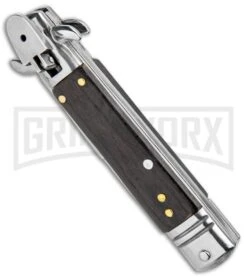 Milano 7.5″ Lever Lock Automatic Knife Black Wood – Bayonet Satin