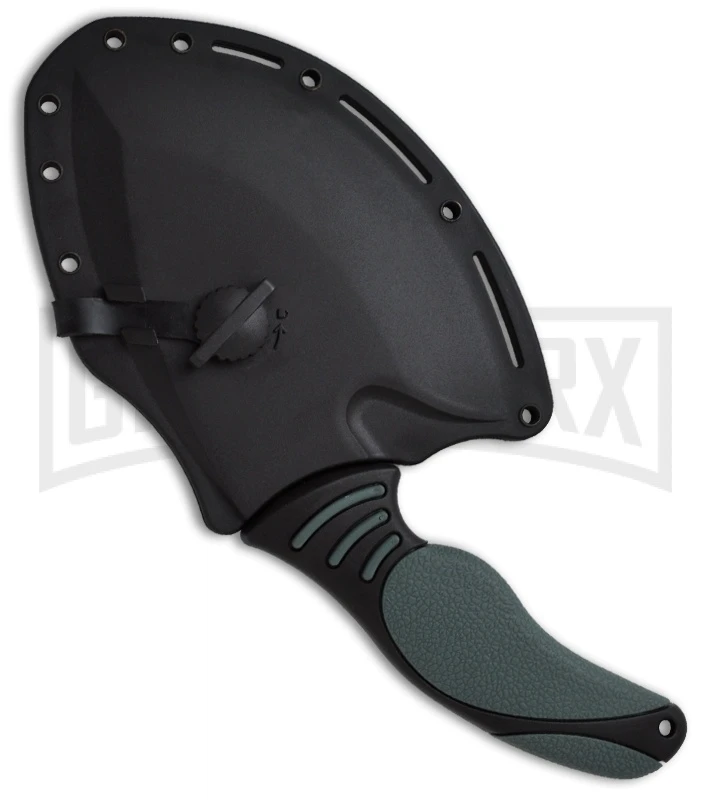 Because the Shakaulu is a heavy tool, Ken designed a special heavy-duty molded polypropylene sheath that incorporates a locking pin, on a flexible retaining strap, that goes through the tool’s thumb hole. This sheath allows secure inverted carry, and is convertible left or right. A removable belt clip is included, and the sheath has multiple slots and grommets to allow lashing to a backpack or pack animal.