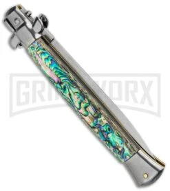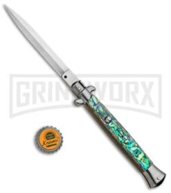 This handcrafted Frank Beltrame 11″ Stiletto Automatic Knife is a beautiful piece to add to any collection. It features a hand polished 440-C stainless steel dagger blade with matching stainless steel round push firing button and sliding safety. The masterful handle features genuine abalone scales with accented brass pins over brass liners and polished stainless steel bolsters. This Frank B has fast firing action and with the classic Italian bolster lock. This will enhance anyone’s knife collection tenfold!