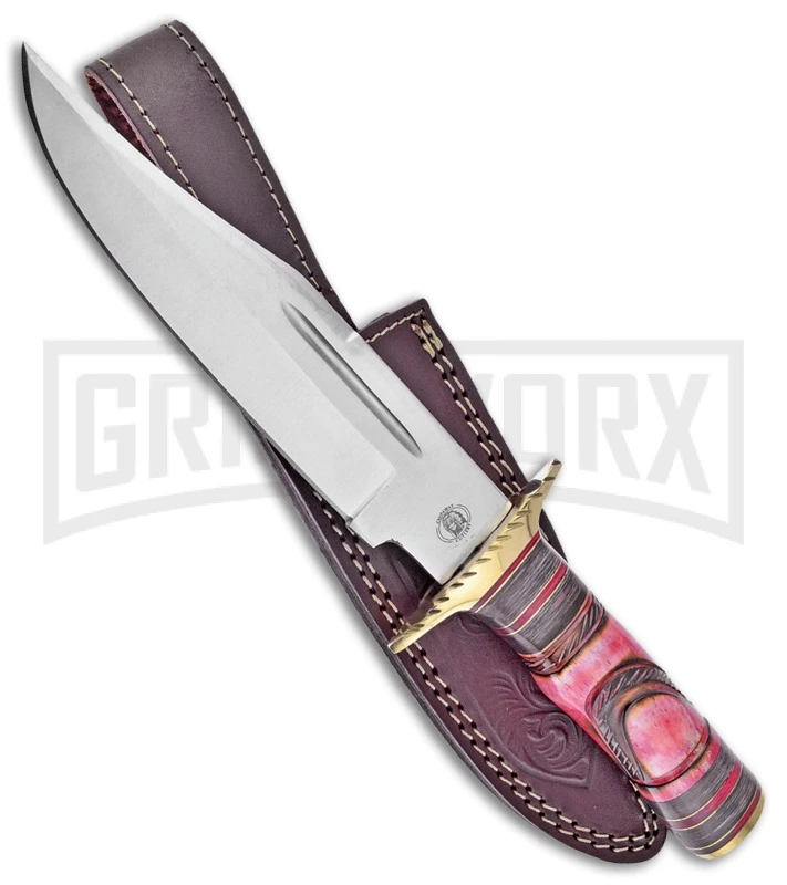 The Frost Cutlery Chipaway Silent Warrior Bowie is a fixed blade knife for hunting. The stainless steel, clip point blade has a satin finish. The handle is made of red bone and pakkawood that features a brass guard and pommel. It comes with a brown leather belt sheath.