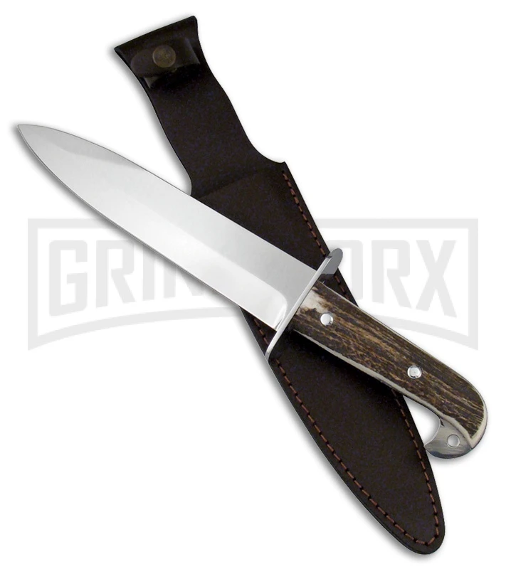 The Frost Cutlery Hen & Rooster Grapple is a fixed blade knife for hunting. The extended tang stainless steel, spear point blade has a mirror finish. The handle is made of stag antler with a stainless steel guard. It has a lanyard hole and comes with a brown leather belt sheath.