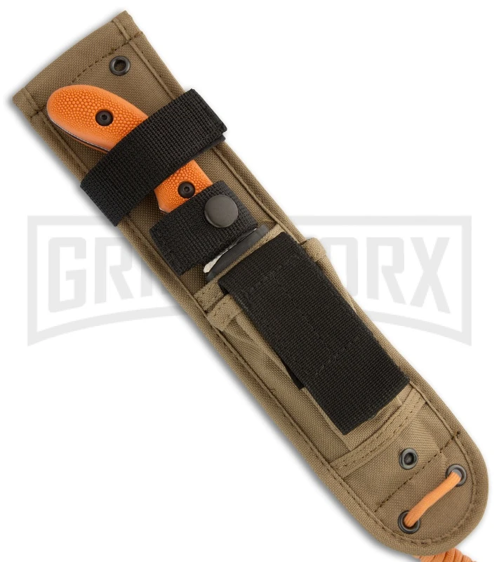 The Johnson Adventure Gamestalker is a hard-use knife for outdoor enthusiasts. The 440A stainless steel blade has a full belly curve and modified Bowie style. The textured orange scales are a great touch on this knife. The Gamestalker comes with a brown nylon sheath.