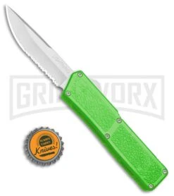 This Lightning model has an zombie green powder coated aluminum handle and a satin finished blade with a partially serrated edge. The handle offers a textured surface for a high performance grip. It has a side mounted firing button that makes the Lightning easy to use and slim and easy to carry.