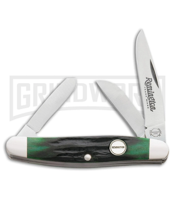 Remington has done their own twist on a traditional pocket knife! The perfect everyday carry because of its compact size and light weight. The three blades are clip point, sheepsfoot and spey styles made out of 440A stainless steel. The green jigged bone handle has nickel silver bolsters with a Remington inlay shield.