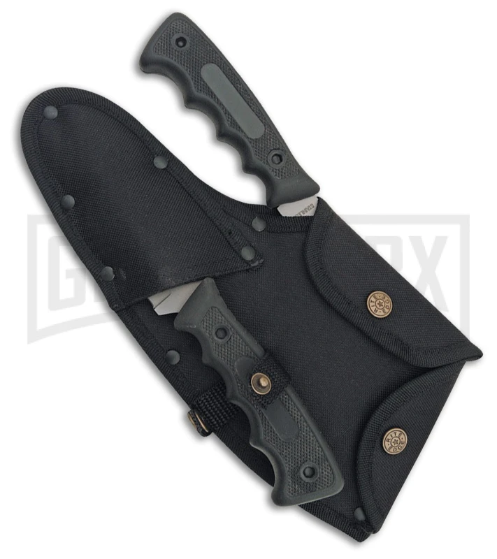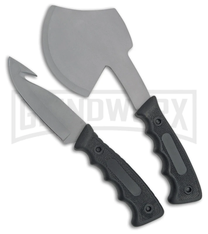 The Rite Edge Hunter Set consists of an axe and fixed blade hunting knife to make your hobby easier. The Hunter Set features bead blast, stainless steel, gut hook and axe blades. The handles are made of black checkered rubber. The black nylon belt sheath holds both.