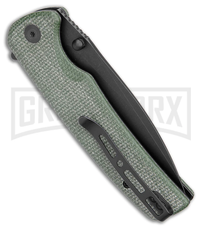 This knife has a green micarta handle and black blade.