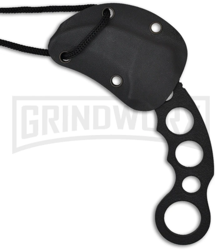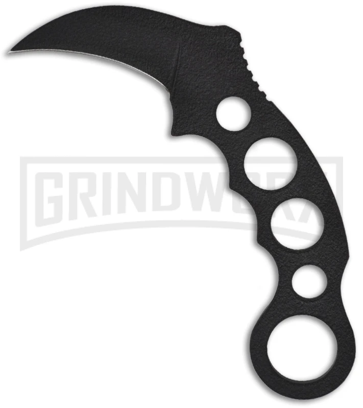 This Tactical Combat Karambit is a sturdy fixed blade knife with a skeletonized stainless steel handle and blade that are black coated for durability. This knife includes a hard sheath and cord for neck carry.