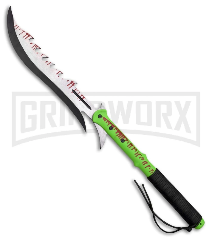 Are you preparing for the zombie apocalypse? This Z-Hunter Guan Dao Machete will leave no zombie in your path. The stainless steel blade has a two-tone finish with a sawback. The handle is a neon green nylon fiber that features dark green cord. Includes a black nylon belt sheath with a rubber patch.